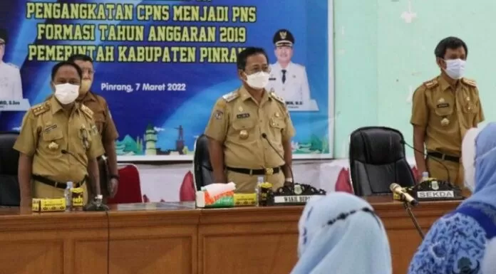 Terkini.id, Pinrang -- Sebanyak 56 Orang Calon Pegawai Negeri Sipil (CPNS) Kabupaten Pinrang formasi tahun 2019, diambil sumpahnya di Ruang Pola Kantor Bupati Pinrang, Senin 7 Maret 2022.