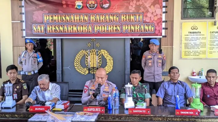 Terkini, Pinrang -- Kepolisian Resor (Polres) Pinrang melalui Satuan Reserse Narkoba memusnahkan barang bukti narkotika jenis sabu seberat bruto 2,2 kilogram dari dua kasus berbeda, di Kantornya, Kamis 25 September 2025.